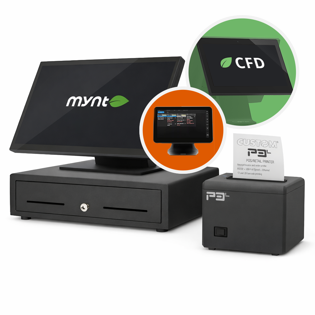 Mynt Connect + Digital Kitchen extends the checkout foundation with tools designed for both guest communication and kitchen execution. It includes a POS terminal, cash drawer, thermal receipt printer, kitchen display system, customer-facing display, and mounting hardware to support clear ordering at the counter and a modern kitchen ticketing workflow.
