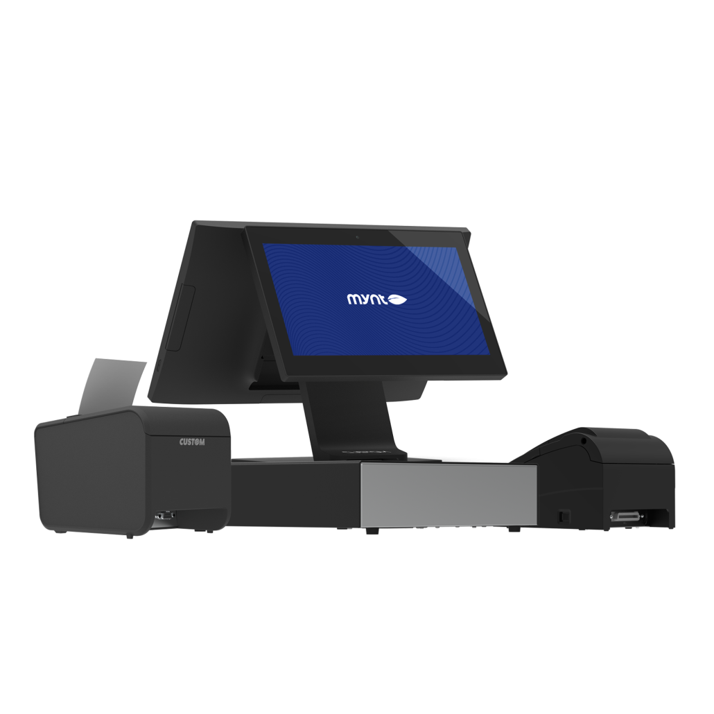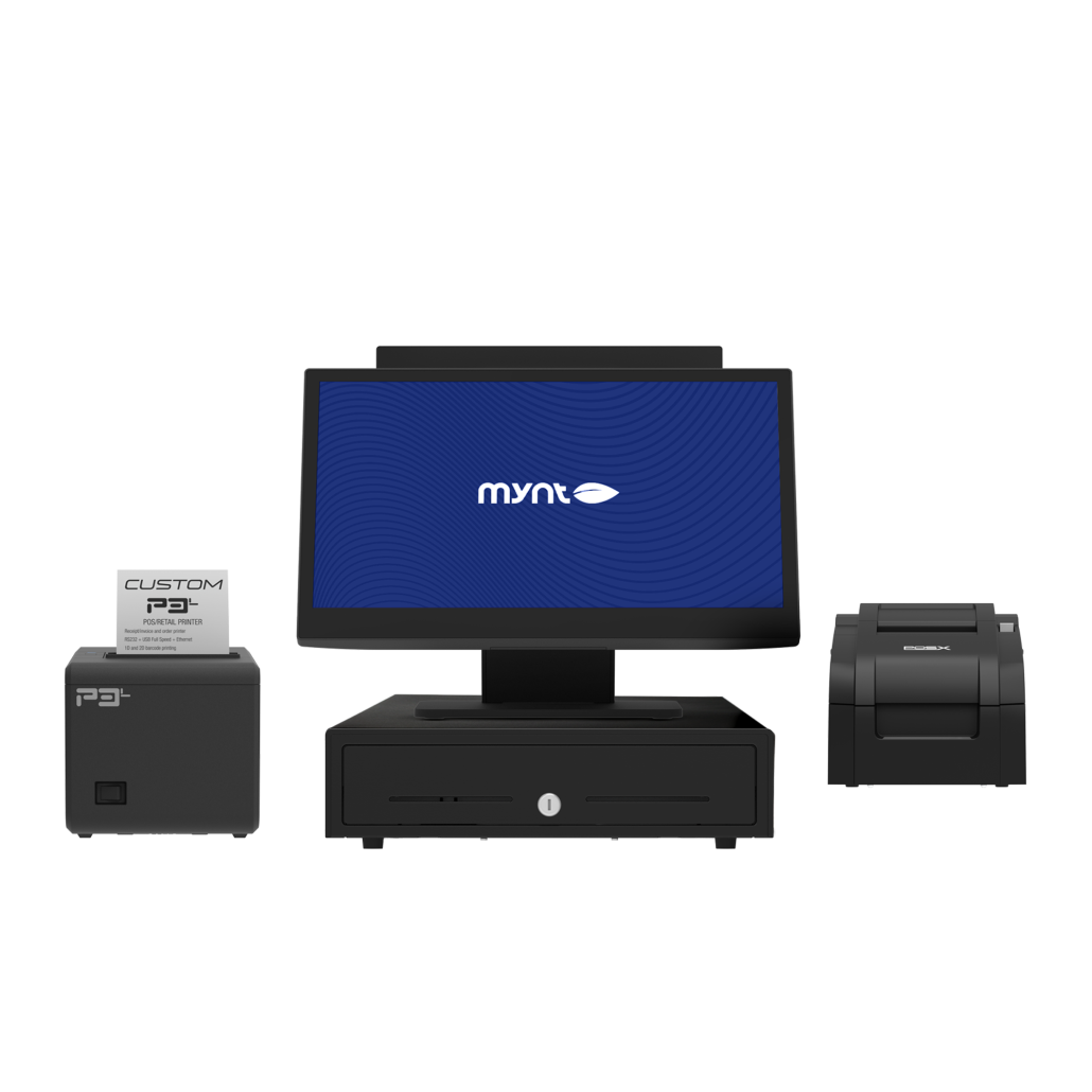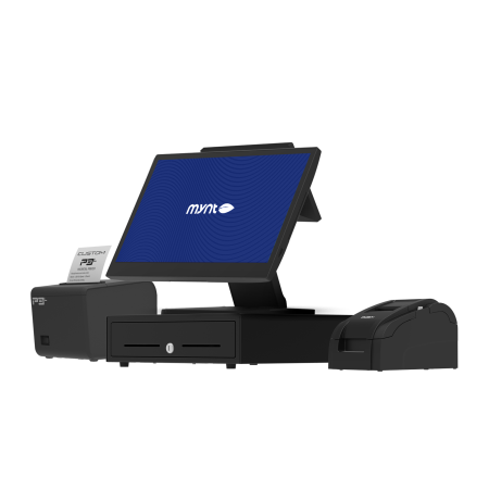 Mynt Connect + Kitchen extends the checkout foundation with tools designed for both guest communication and kitchen execution. It includes a POS terminal, cash drawer, thermal receipt printer, impact kitchen printer, customer-facing display, and mounting hardware to support clear ordering at the counter and reliable ticket flow to the kitchen.